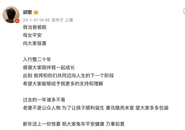 1月底,胡歌在微博上空降式官宣“我当爸爸啦”,