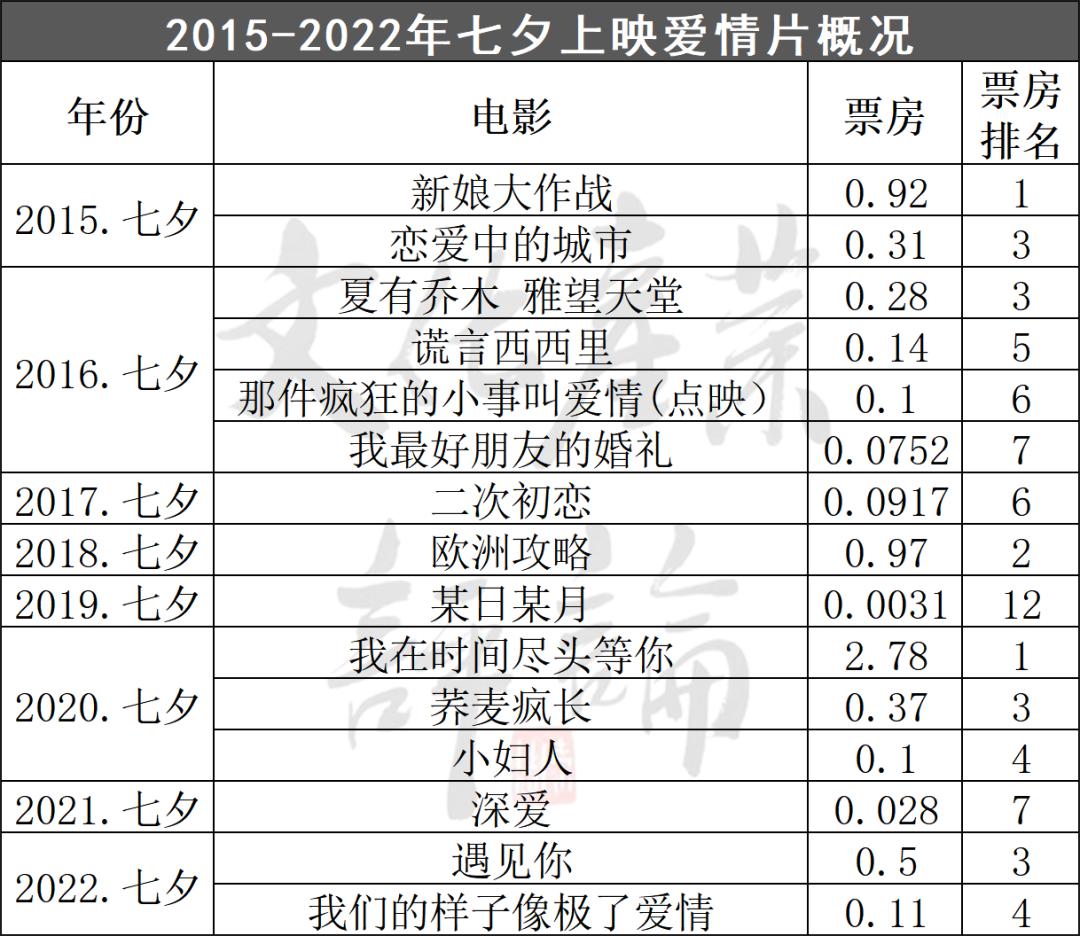 近几年,随着对中国传统节日的重视,情侣们过七夕开始流行,七夕也成为了爱情片的重要上映日期。