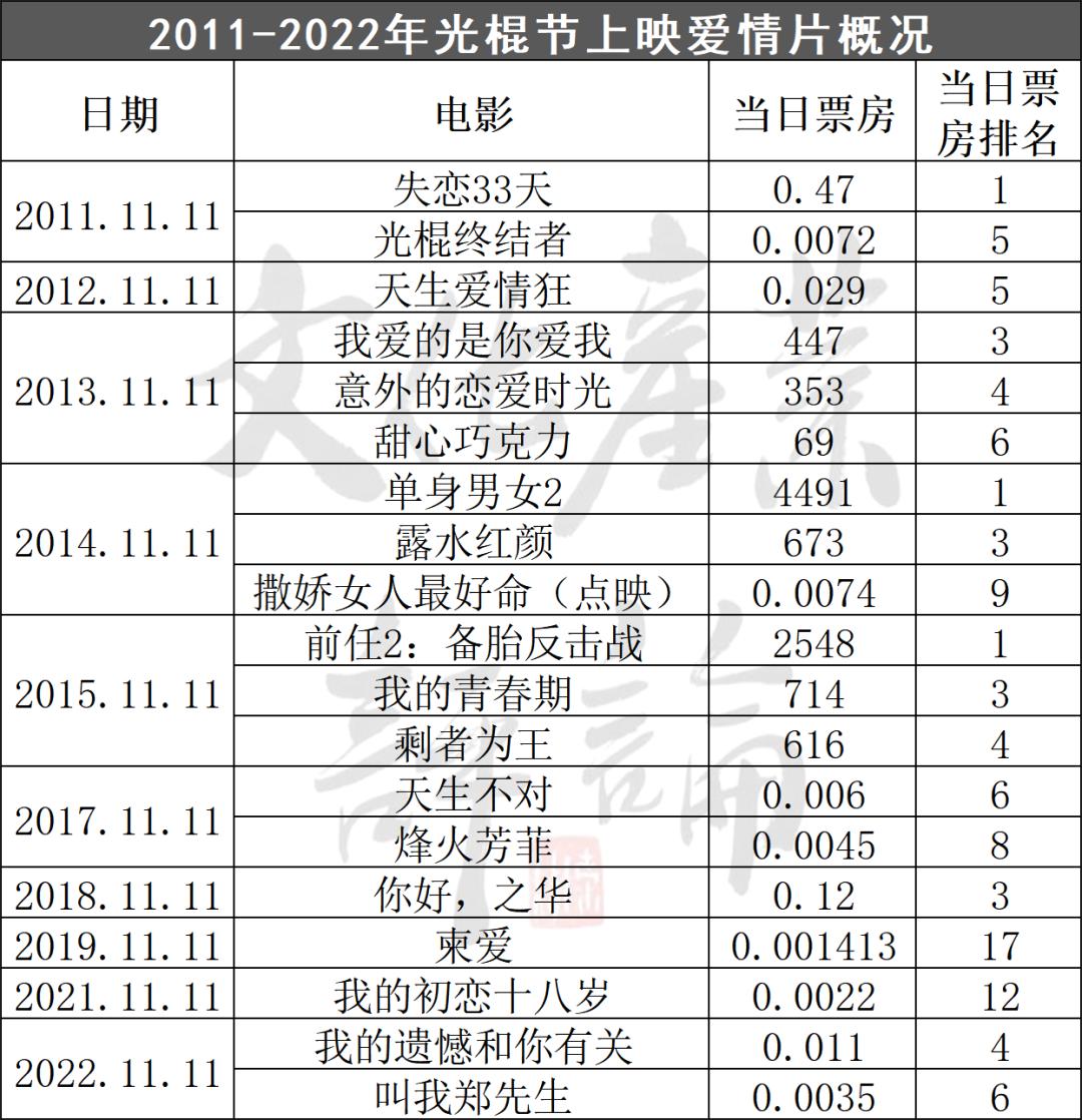 2012年的《天生爱情狂》以292万的票房排在当天第五位, 2013年、2014年和2015年都有三部爱情片同时上映,爱情片成为这三年光棍节的票房产出主力。其中,2014年的《单身男女2》和2015年的《前任2:备胎反击战》则位居当日票房第一位,《忍者神龟:变种时代》《移动迷宫》《移动迷宫2》等好莱坞大片都曾被“碾压”。众多一线明星,如林志玲、刘亦菲、高圆圆、周迅、杨千嬅、古天乐、郭采洁、舒淇、彭于晏等,在光棍节这天“陪伴”过观众。