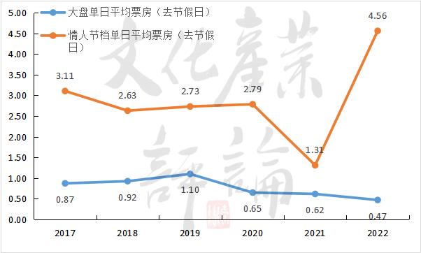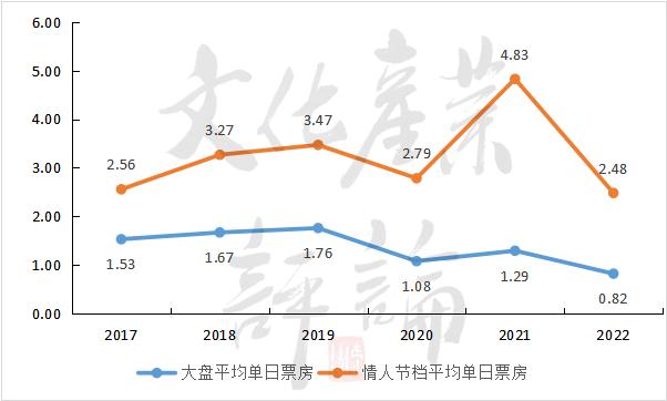 △图 2017-2022年去掉节假日和周末后的情人节档、大盘平均单日票房