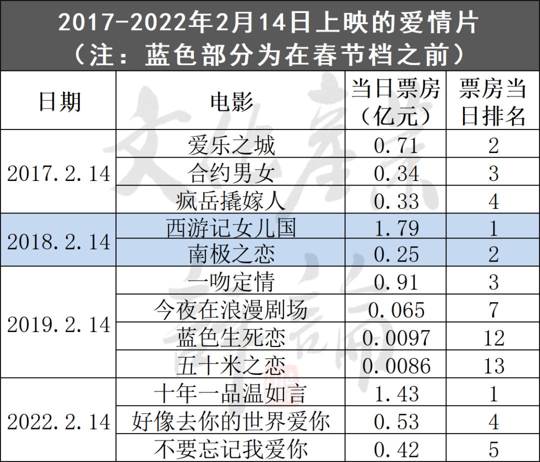此后,除了包含在春节档内的2021年和电影院关闭的2020年以外,2017年以来,每个2月14日都有至少2部爱情新片上映。其中,只有2018年的2月14日是在春节档之前,这一年春节档新片《西游记女儿国》选择在情人节点映,票房高达1.79亿,也是迄今为止2月14日单片单日票房最高记录。
