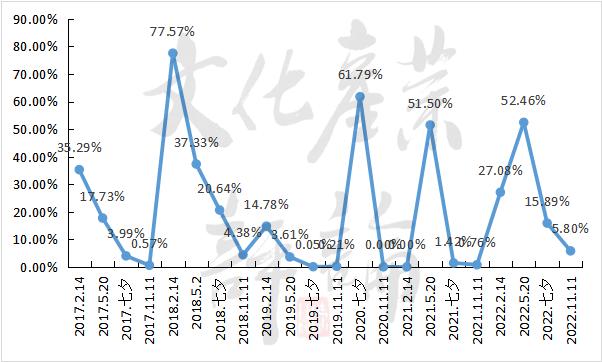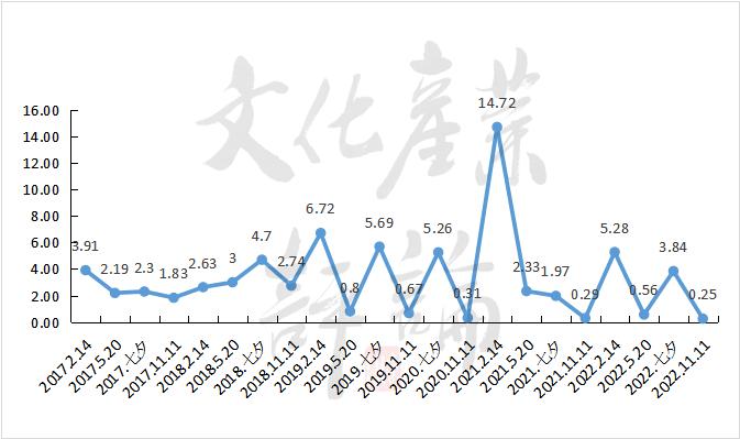 具有明显情人节档期效应的日期其实有四天,分别是2月14日的西方情人节,寓意“我爱你”的5月20日,中国传统七夕节,以及以光棍节著称的11月11日。为方便表述,下文将这四天都统称为情人节档。