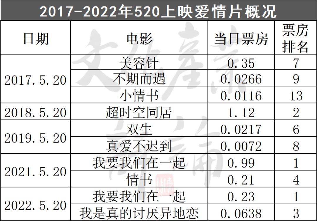 作为谐音梗而带火的档期,520档可以追溯到2017年,《美容针》《不期而遇》和《小情书》三部爱情片上映,但票房不高。