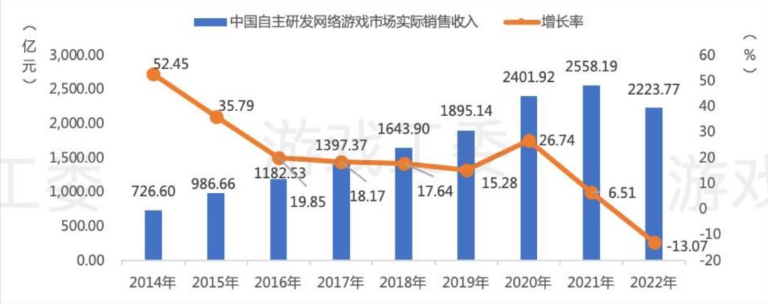 这种变动,对国内自研产品收入的影响更大,报告显示去年中国自主研发网络游戏市场实际收入同比下滑13.07%,跟2021年比少了334亿元。
