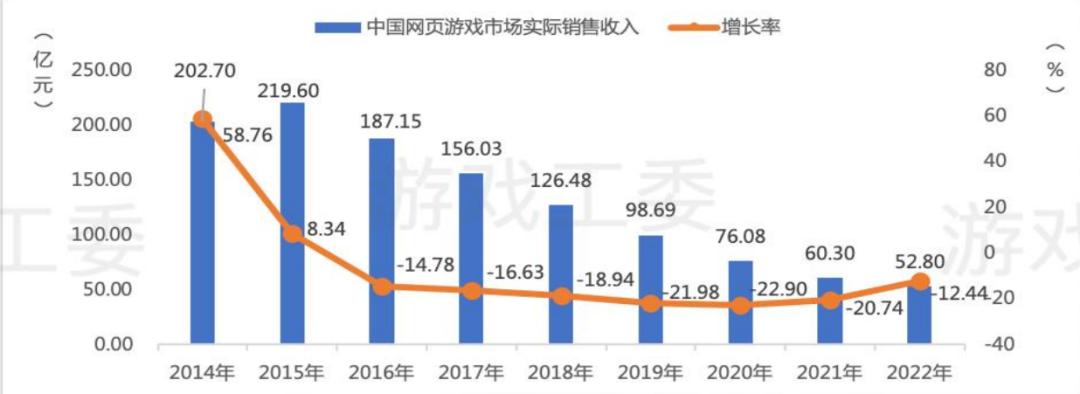 中国网页游戏市场实际销售收入连续7年下滑,今年收入规模仅为52.8亿元,相当于2015年的四分之一;