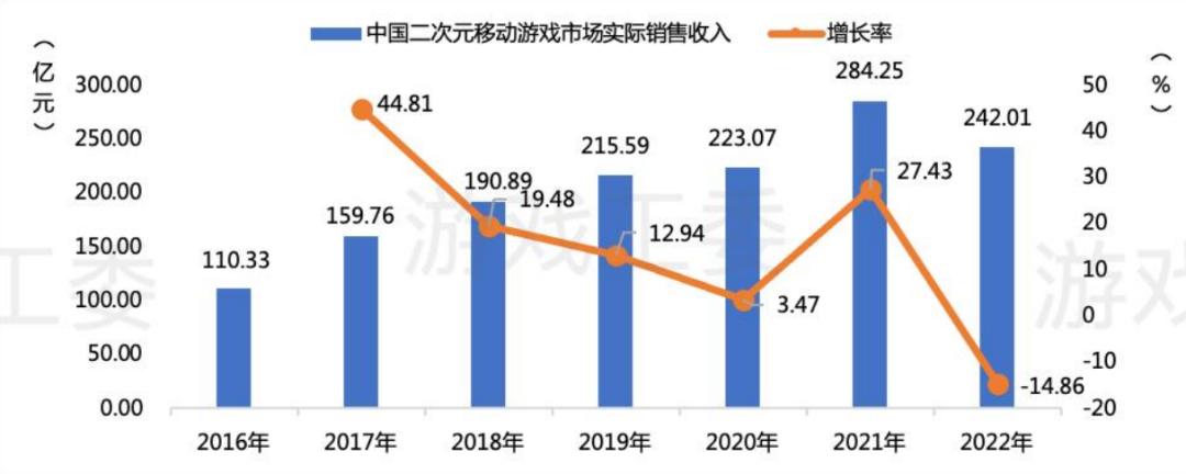 产业报告显示,2022年中国二次元移动游戏市场规模为242亿元,同比下降14.86%。而一个月前,SensorTower公布了《原神》移动端流水突破280亿人民币,即使两份报告的计算标准不一致,但也能推测《原神》应该也在二次元市场中占据了不小的比例。