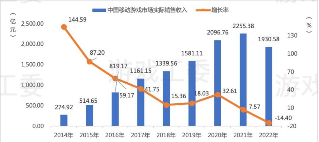 出海与国内收入下跌同时,细分游戏市场的情况也不容乐观。2022年,中国移动游戏市场实际销售收入为1930.58亿元,同比下滑14.4%,是2014年以来出现的首次下滑;