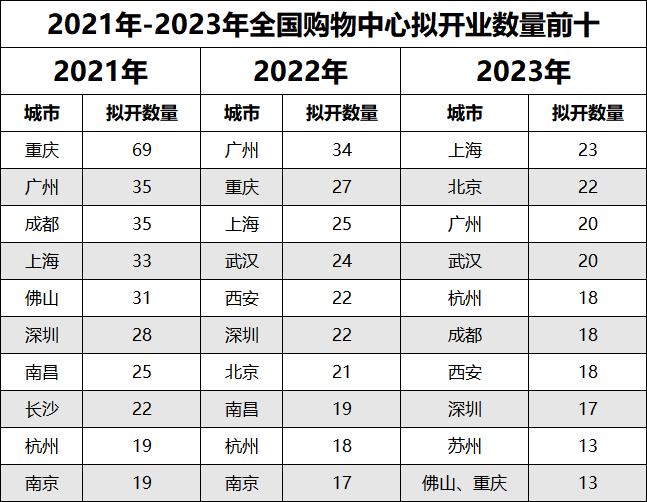 曾在过去两年上演购物中心开业热潮的重庆则是慢下脚步,今年拟开业数量为13个。