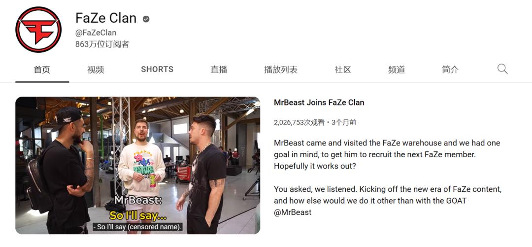 Faze油管主账号有863万订阅者,加上旗下内容创造者的粉丝数,总量过亿
