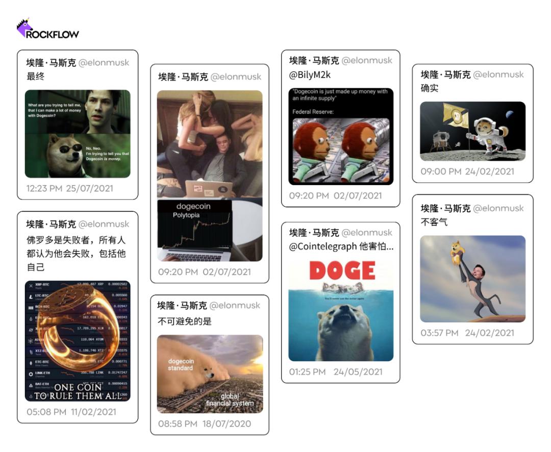 通常,马斯克的更新内容大多是“模因”(也称为“迷因”)——这里指网上被广泛复制和分享的笑话图片或视频。这些模因通常来源于受他的追随者们所欢迎的小众网站或在加密货币留言板里。有些是关于马斯克的,有些看起来是原创的。