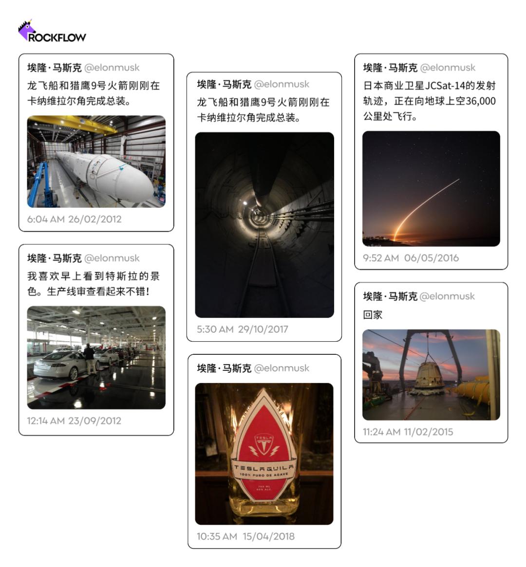 早期使用Twitter时,马斯克通常会发布一些宣传生意和业务的照片:SpaceX 火箭发射和特斯拉汽车装配线(以及偶尔的一瓶龙舌兰酒。)
