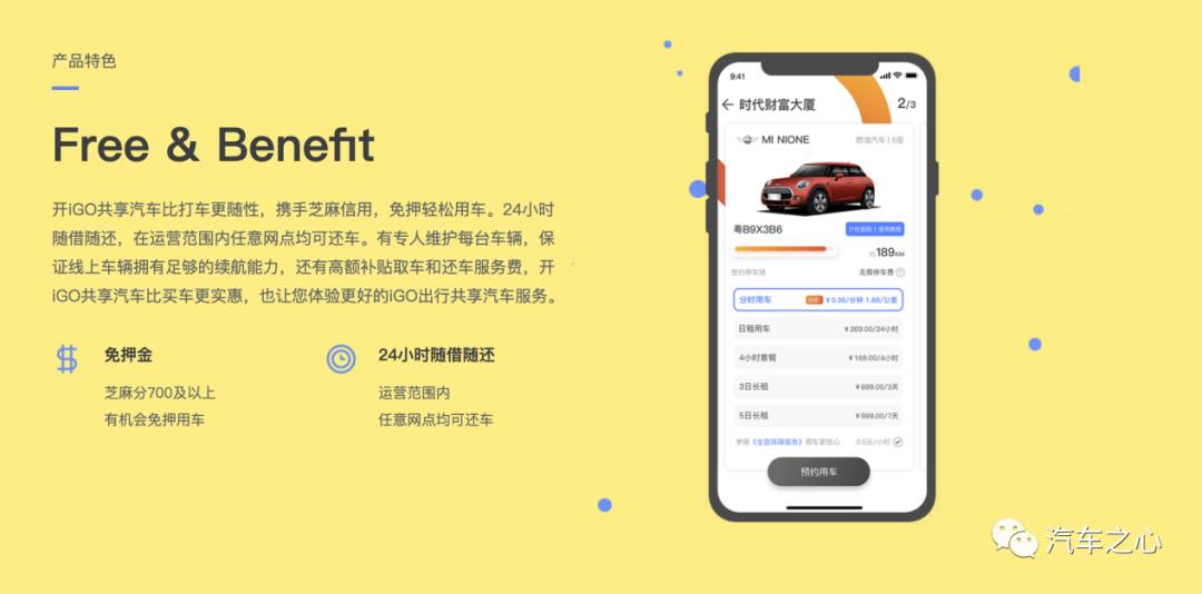 在 iGO 出行的官方网站上,写着随借随还、任意网点还车、专人维护等诸多宣传字样,对消费者而言虽然有一定的吸引力,但也体现着分时租赁行业的弊端。
