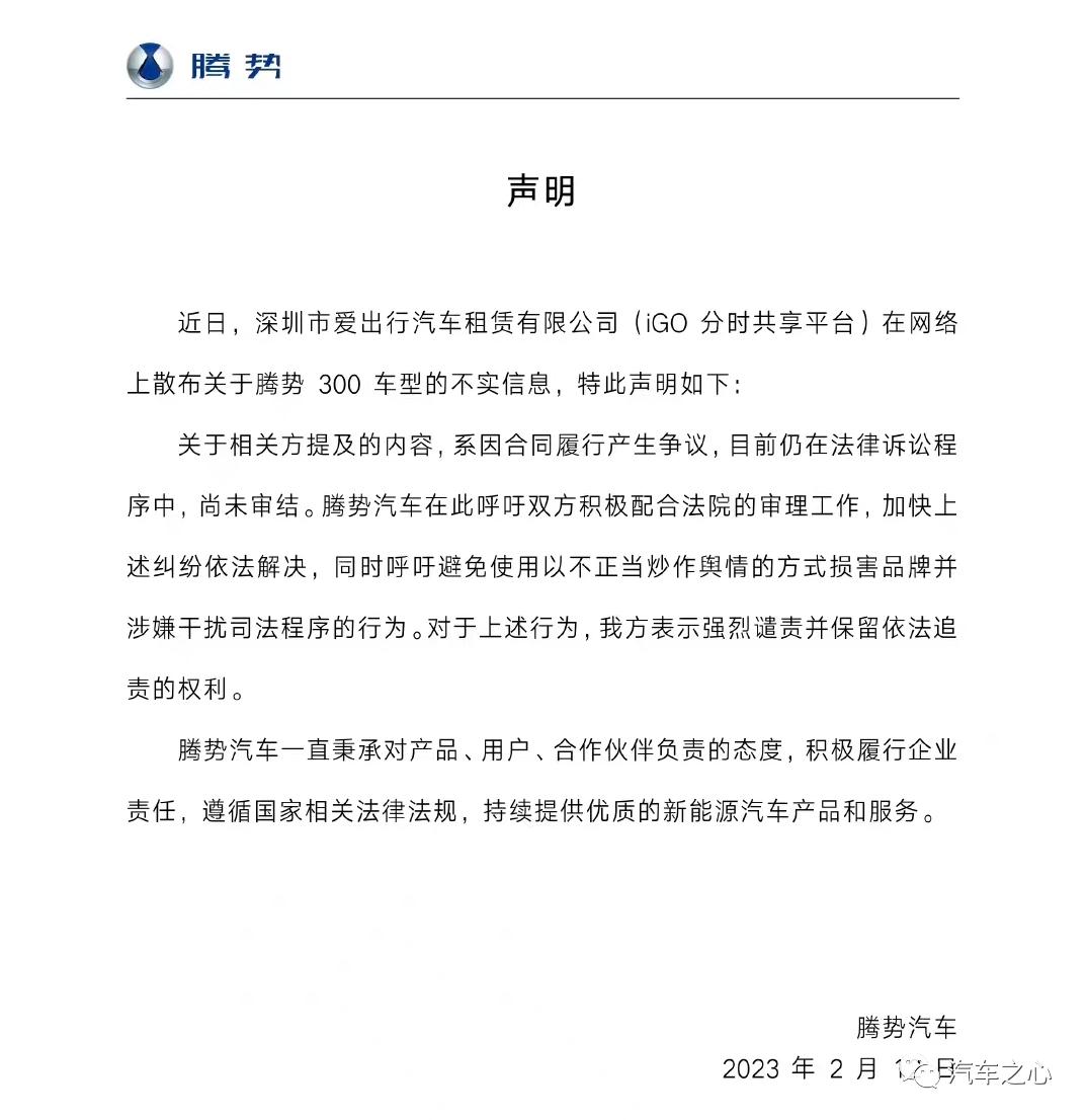 而腾势方面则表示,其与 iGO 出行之间的矛盾是因合同履行产生争议,目前仍在法律诉讼程序中,尚未审结。