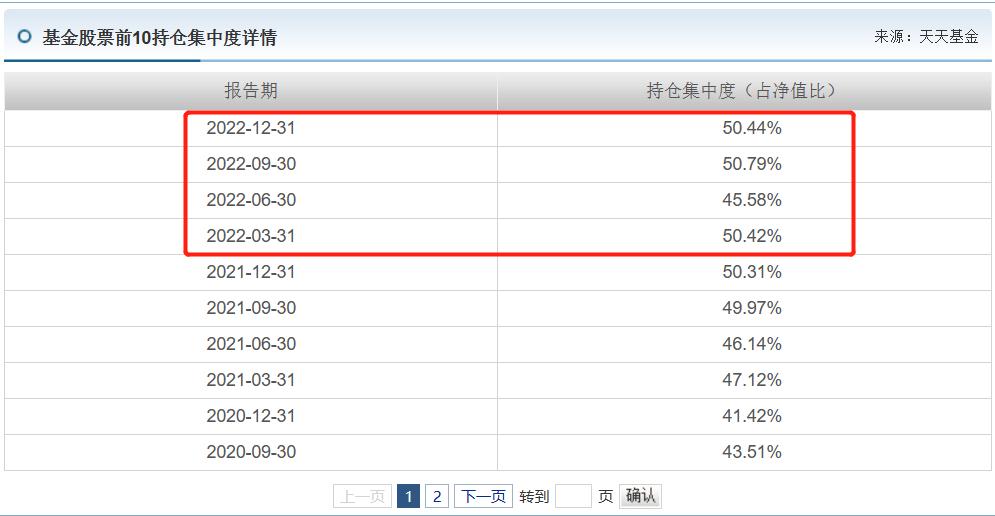 (傅鹏博管理的睿远成长基金2022年前十持仓集中度,来源:天天基金网)
