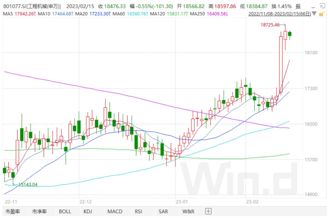 在信贷“开门红”的刺激下,2月13日,申万工程机械指数大幅拉升近8个点,龙头三一重工、杭叉集团、长龄液压涨停,徐工机械、安徽合力涨约8%,中联重科、恒立液压等涨超6%。