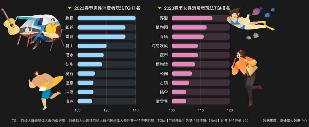 马蜂窝数据提到,年轻父母的出游意愿得到明显提高,其中80后、90后占比分别超45%、25%,且男性(39%)更喜欢自驾游以及由户外场景拓展出的各种运动如蹦极、邮轮、露营、爬山、潜水等,女性(61%)更喜欢亲子游,更偏爱植物园、寺庙、海岛、夜市、博物馆等有趣、有内容、值得逛和买的旅游场景。