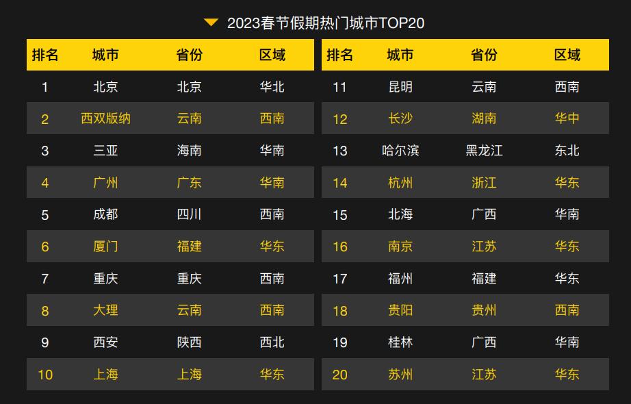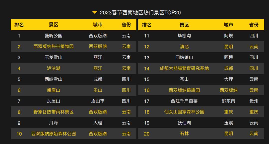 马蜂窝数据显示,2023春节假期热门省份前10中有7个都是南方省份,他们分别是云南、海南、四川、福建、广西、湖南。而据第一财经统计的2023年春节各省接待游客人次,截至1月28日,四川、云南分别接待5387、4514万人次,分列榜单一二名。