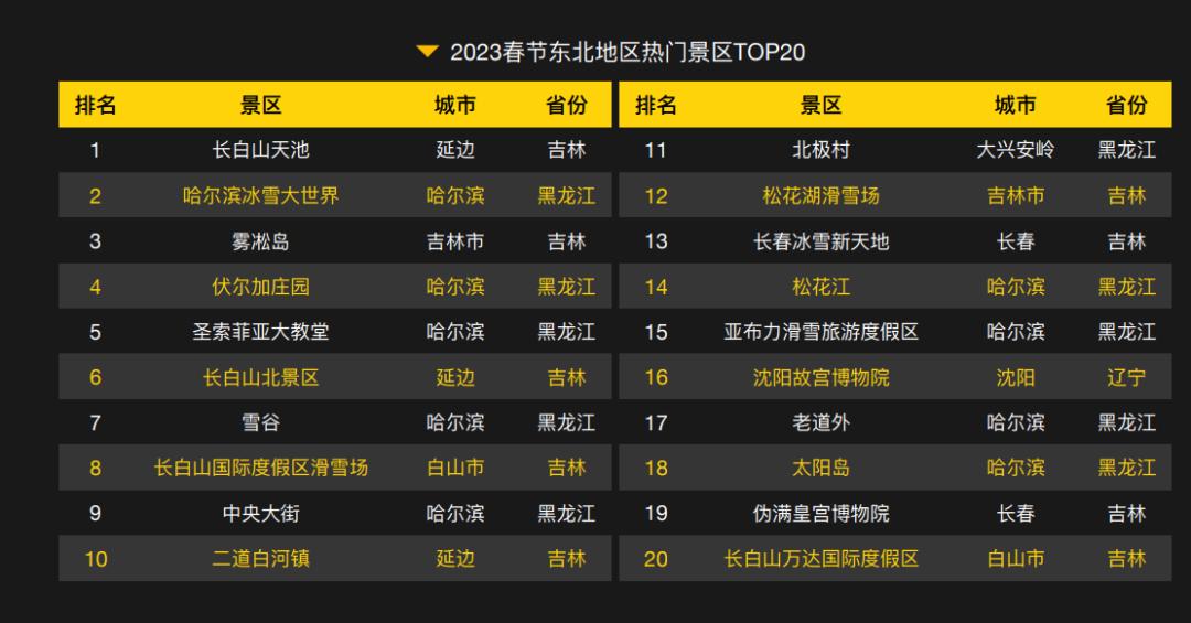哈尔滨机场透露,春节期间从北京、上海、广州、成都、重庆等城市飞往哈尔滨的航班客座率达到80%。马蜂窝数据显示,2023春节期间,长白山天池、哈尔滨冰雪大世界、雾凇岛、伏尔加庄园、圣索菲亚大教堂、长白山北景区、雪谷、长白山国际度假区滑雪场是东北地区热度最高的景区。