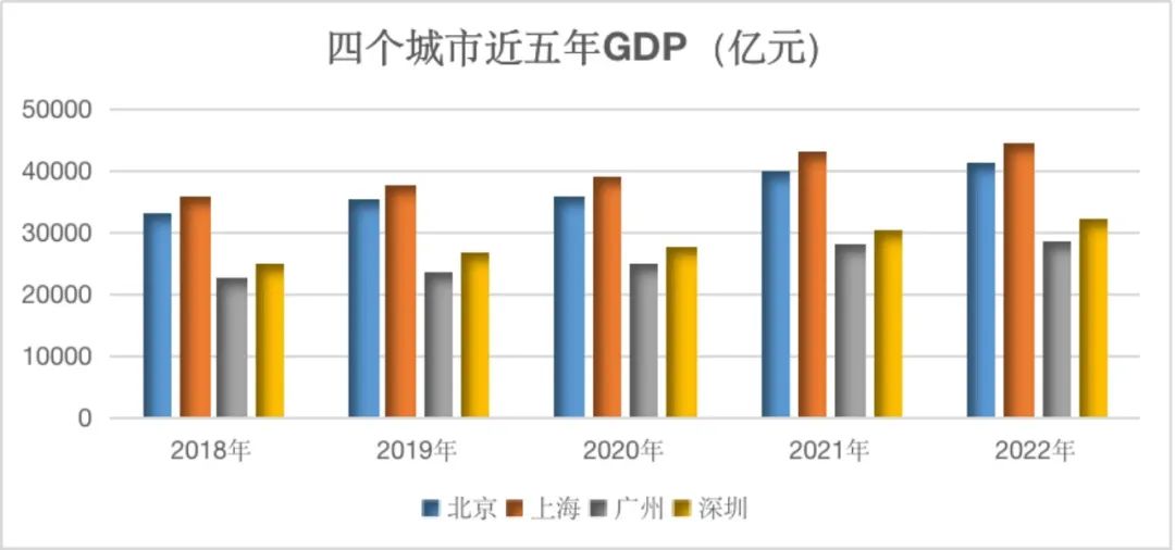 下图为过去五年北京、上海、广州和深圳GDP总额和GDP增速:
