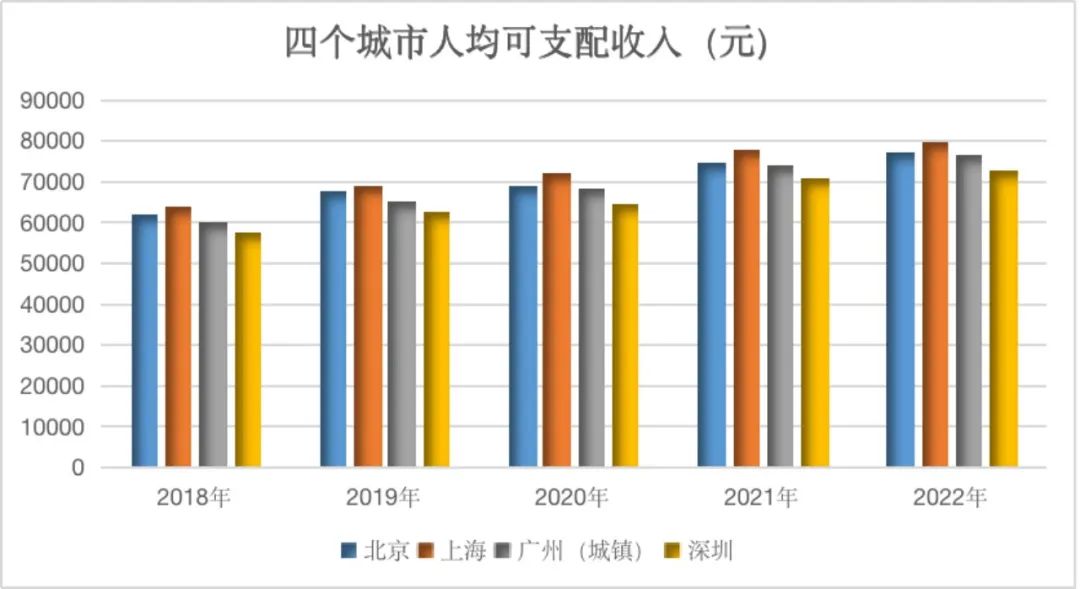 深圳:2022年深圳居民人均可支配收入72718元,同比增长2.6%;2023年居民人均可支配收入稳步增长。