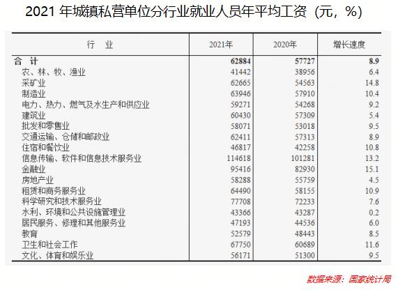 值得注意的是,私营单位就业人员的工资水平普遍要少于非私营单位。从数据上看,2021年城镇私营单位就业人员年平均工资为62884元,明显低于非私营单位的106837元;而对于工资水平最高的三个行业来说,私营单位就业人员每年要比非私营单位的就业人员足足少赚6~8万元。