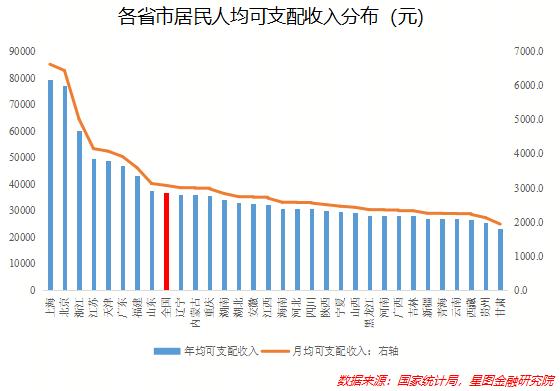 若是换算成月度来看,人均可支配收入超过5000元的只有上海(6634元)、北京(6451元)和浙江(5025元),这三个省市常住人口数量之和约为1.1亿人,占全国比重仅有不到8%;而每月人均可支配收入在3000元以下的省市多大22个,其中排名最低的甘肃,每月人均可支配仅有1939元,还不到上海和北京的1/3。