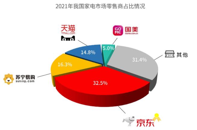 中国电子信息产业发展研究院发布的《2021年中国家电市场报告》显示,国内家电市场中,京东以32.5%的份额位居第一,第二名苏宁易购占据16.3%,紧随其后的天猫份额为14.8%,昔日的家电霸主国美电器仅为5%。