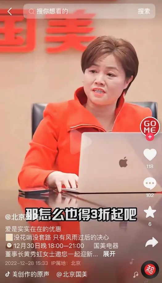 黄秀虹也会在国美的短视频账号内出镜,人设是“接地气的女企业家”。/@北京国美