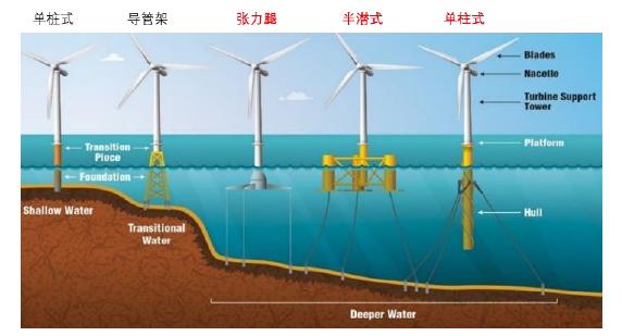 具体到风电的漂浮式技术,其结构主要有如下几种:半潜式、单柱式、张力腿和驳船式,半潜式是目前应用最多的技术方案。