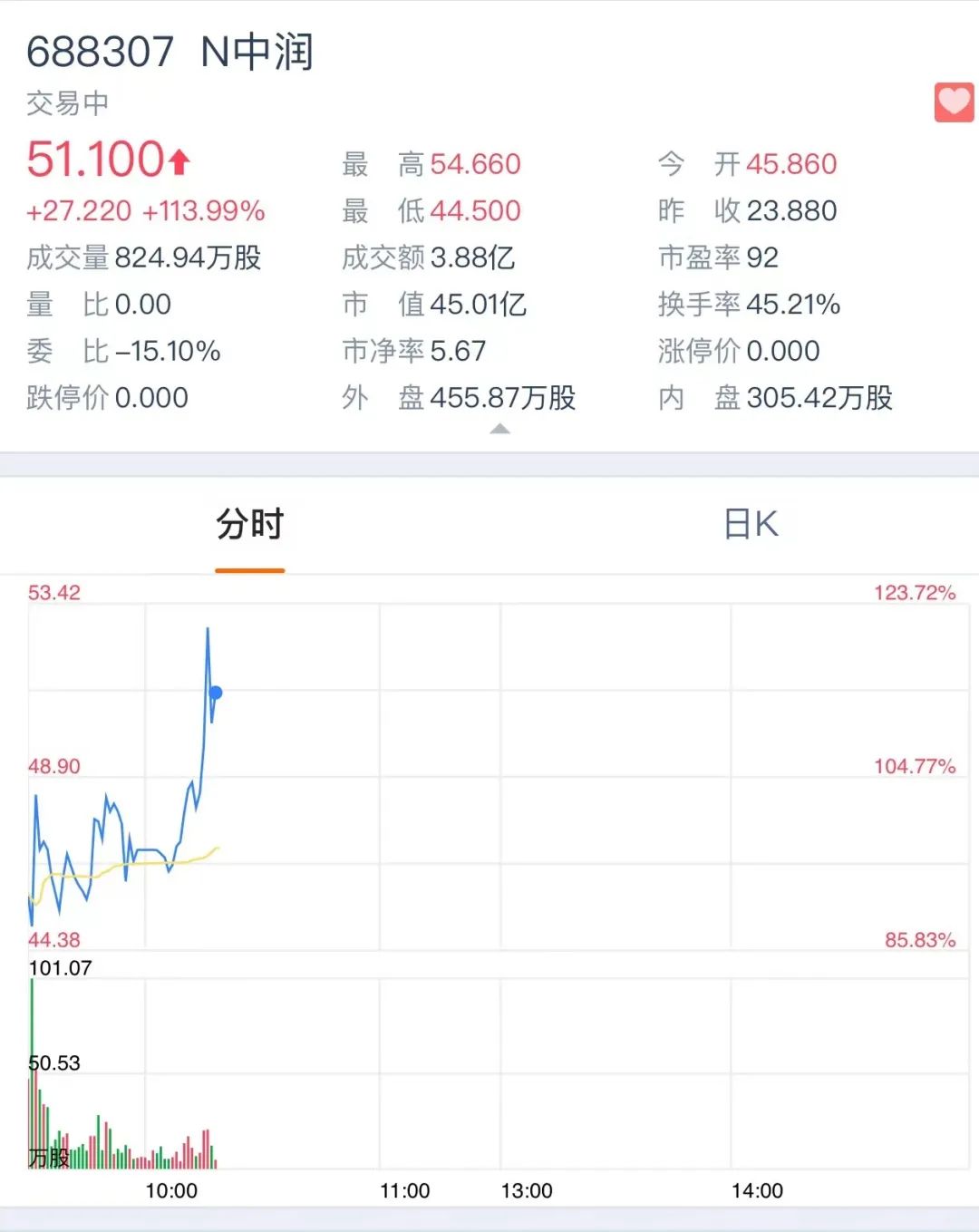 2月16日,嘉兴中润光学科技股份有限公司(简称中润光学)登陆科创板,发行价为23.88元/股,开盘价为45.86元/股,较发行价上涨92%。截至10:17分,中润光学股价为51.1元/股,较发行价上涨114%,市值达45亿元。