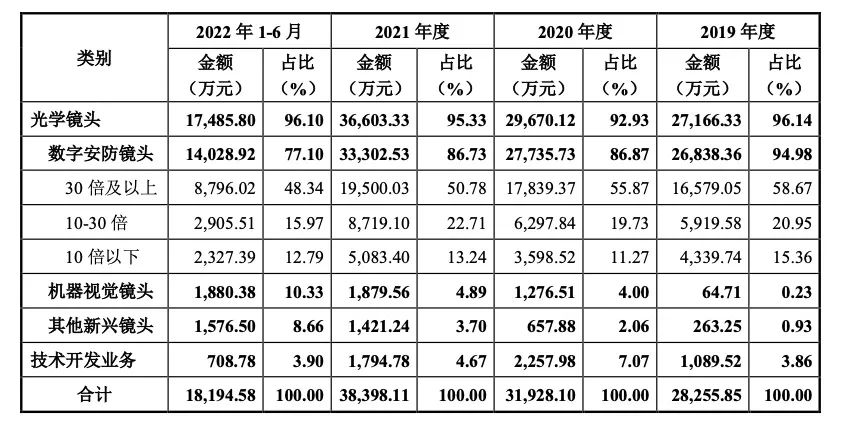 其中,光学镜头产品销售收入及技术开发业务收入为公司主营业务,根据应用领域可划分为数字安防、机器视觉及其他,其收入在报告期内分别为2.72亿元、2.97亿元,3.66亿元和1.75亿元,占营业收入的比例分别为 99.42%、95.50%、 96.84%及 96.90%。