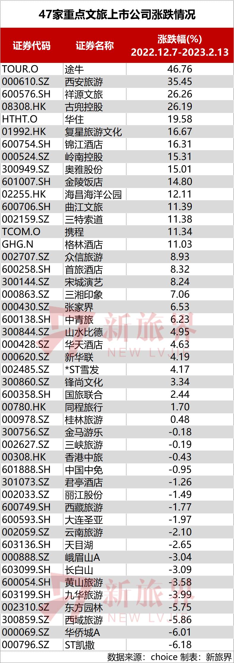 据新旅界(LvJieMedia)统计,自2022年12月7日至2023年1月13日,新旅界重点关注的47家文旅上市公司平均涨幅6.6%,大大好于同期上证指数2.5%的涨幅,在各类行业中涨幅居前。