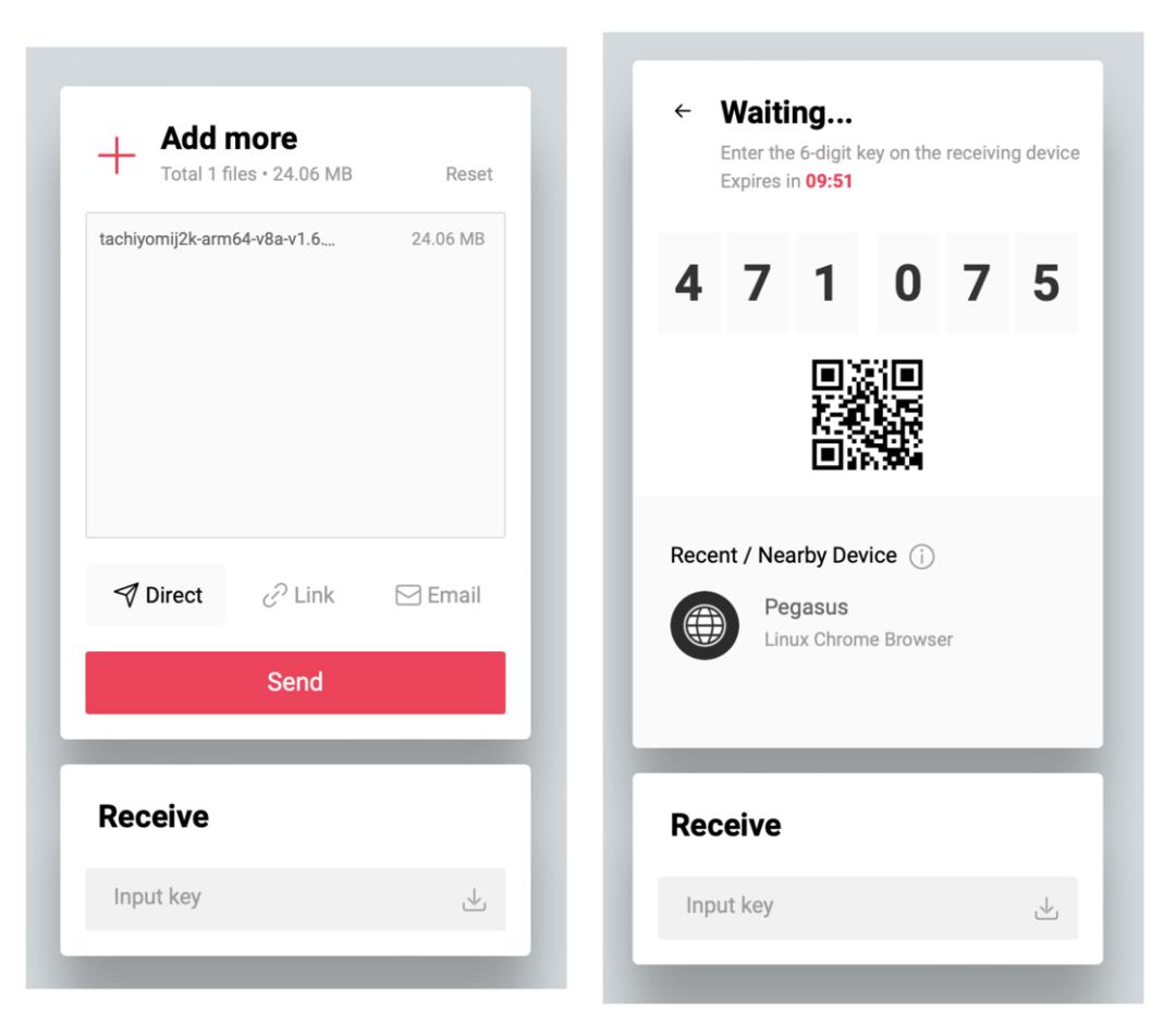 选择想要分享的文件后,你就可以选择分享方式了——而这也是 SendAnywhere 的独门绝技:如果想要在局域网内传输的话,你可以选择使用「直接分享」。此时,SendAnywhere 会生成一个 10 分钟内有效的 6 位数字密钥,你只需要在接收端输入密钥就可以实现内网传输,速度只取决于家里的网络规格。