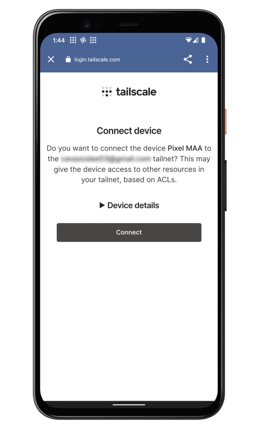 在内网访问功能之外,Tailscale 也提供了一个跨平台的内网文件传输服务 TailDrop 。想要使用 TailDrop 的话,你需要首先在所有设备上都安装 Tailscale 的 app 并且登陆,在登录账号的过程中 TailScale 就会询问你是否要将当前设备连接到你的账号:
