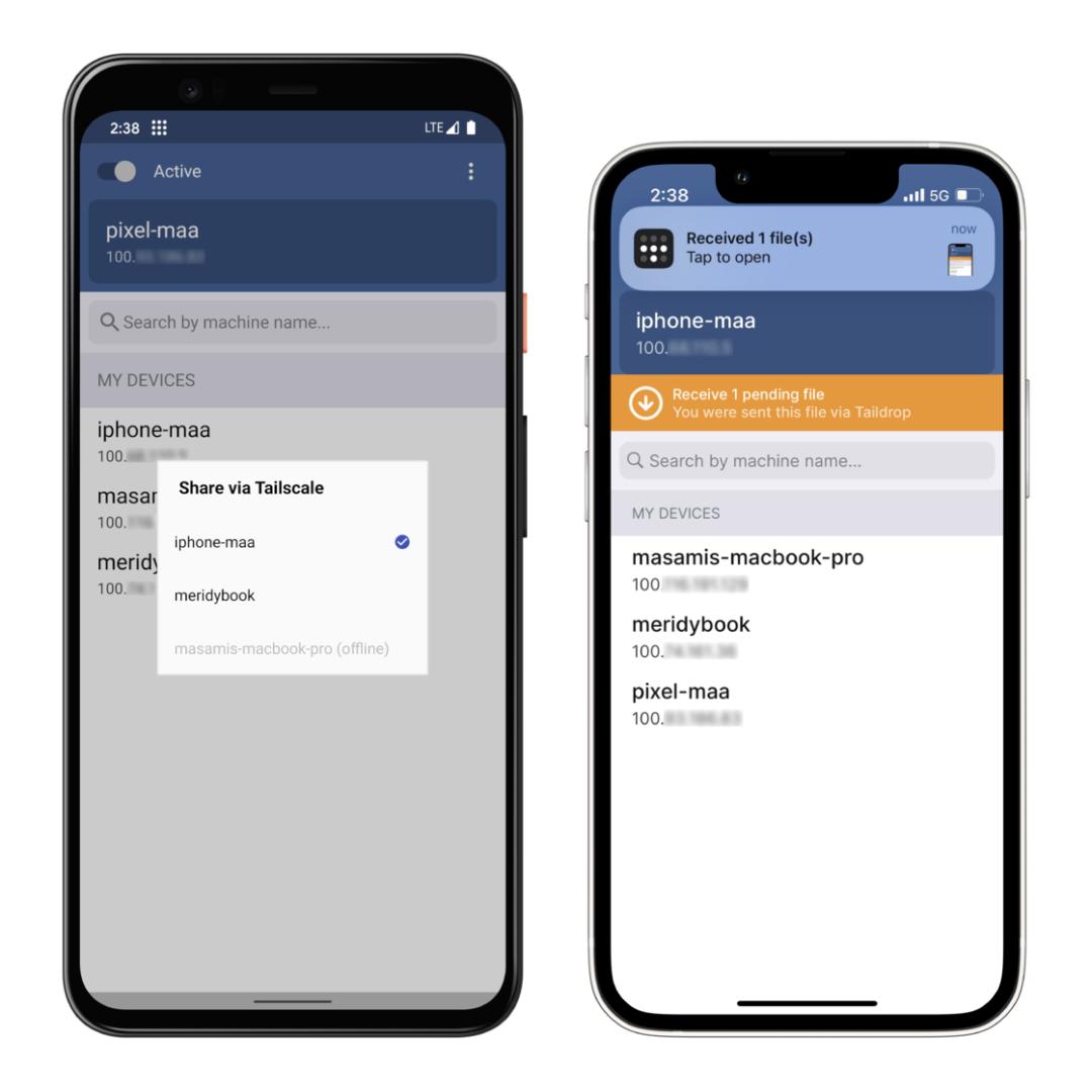 不过得益于 Tailscale 所基于的 SD-WAN 协议和「免确认传输」的特点,如果你需要在出门在外的同时向局域网内的设备传输文件(比如旅游的时候实时向家里的电脑同步照片)的话,Tailscale 将会是一个可行的方案,或者直接在两台不在同一局域网内的设备(比如同时在使用流量的两台手机)之间传输文件: