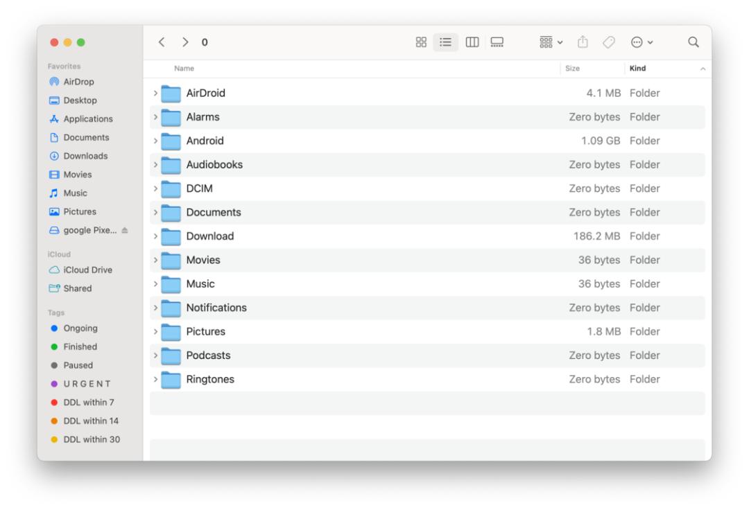 无论选择哪种方式连接后,MacDroid 都会将已连接的设备直接显示在访达的侧边栏中,进行文件管理的方式和使用移动硬盘别无二致: