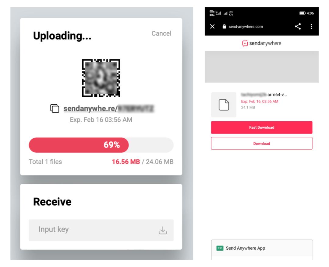 而如果你注册了 SendAnywhere 账号的话,就可以使用「链接分享」了,此时 SendAnywhere 则会将文件分散上传到 P2P 网络中,并且生成一个分享链接。48 小时的文件有效期内,你可以在任何地方用任何网络来下载这个链接所指向的文件,此时的传输速度取决于接受者的网络状况和 P2P 节点的分布情况。