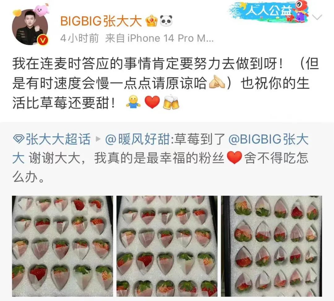 而且他的人脉确实给观众带来了收益。对于杨幂、黄明昊等艺人的粉丝来说,正主微博不营业,但张大大对发合照自拍有求必应,反而多了看到偶像的机会。他这次直播的“许愿”主题,也能活用他的人脉资源,帮张碧晨粉丝发语音,承诺要送TFBOYS十周年演唱会门票——在切实的利益面前,过去那些并不实质性的“黑料”,自然显得无关紧要了。