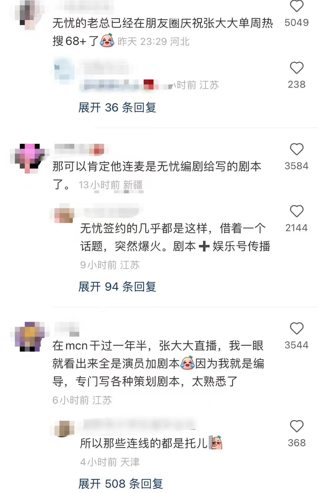 张大大的直播间红了,争议也随之而来:他的抖音主页显示他签约了知名MCN公司无忧传媒,直播里的内容也被怀疑是有剧本事先设计好的,在2月15日,“张大大直播剧本”就登上了微博热搜榜。