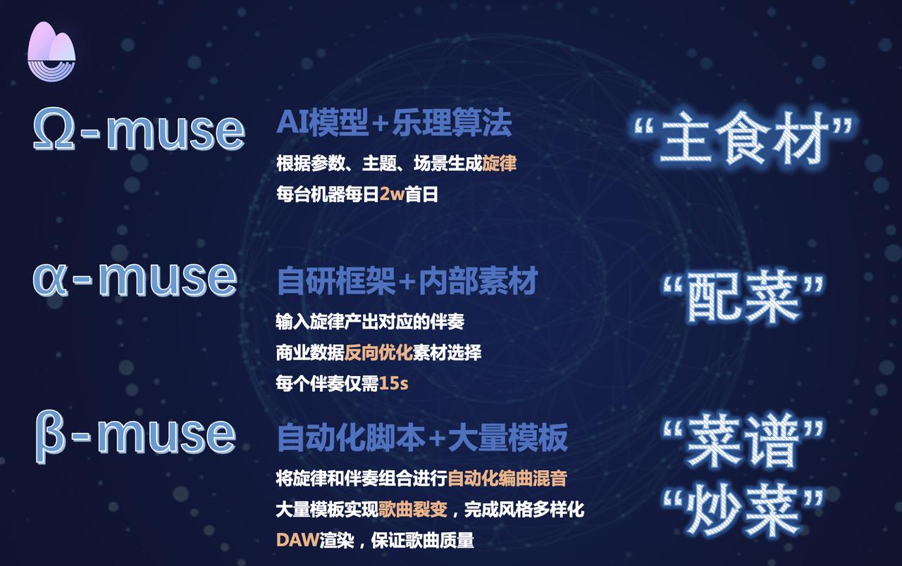技术层面,期音自主开发了“Alpha-muse”伴奏作曲系统、“Beta-muse”编曲混音系统以及结合AI模型和乐理算法的“Omega-muse”旋律写作系统。三者结合,将音乐中的要素进行数学建模,并构建了一套对这些要素进行分析、组合的算法,快速生产旋律、伴奏和编曲。同时,以其独家素材库来为生成作品的匹配精度和多样性提供保障。