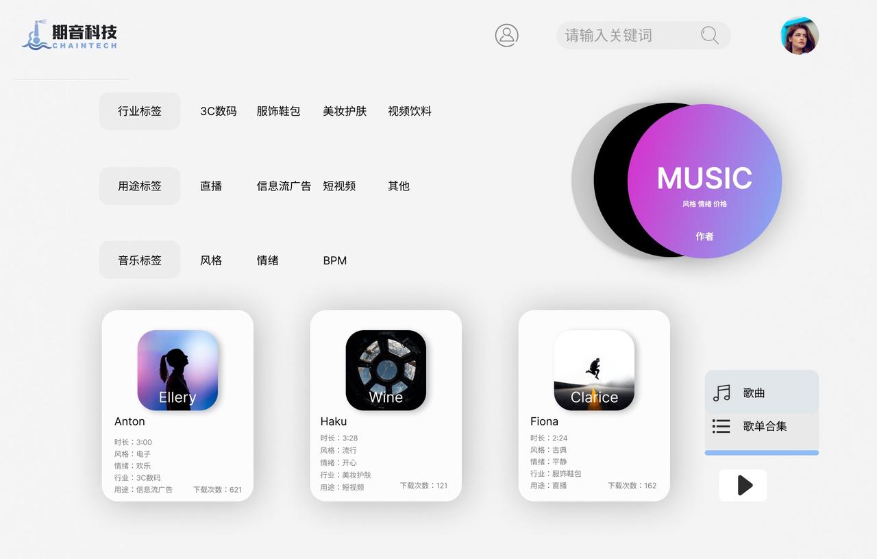 - B端的目标客户包括音乐及短视频平台、MCN及影视机构等商用音乐方、唱片公司等。期音作为行业最上游的版权音乐供应商,以年框服务为上述机构提供平价、可定制、可维权的整曲制作和商用音乐解决方案,与这些中游机构共建曲库、音乐人IP,同时与下游宣发端共享音乐版权收益。