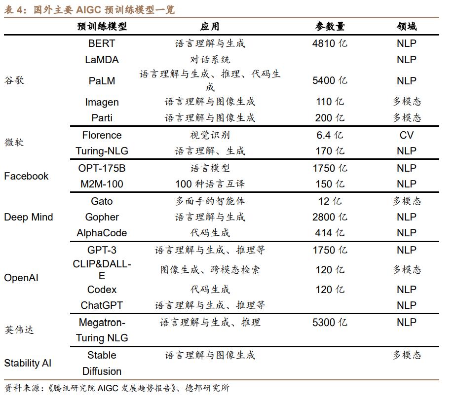 ChatGPT持续热度下,AI投资已经成为北美各大云厂商下阶段投资主力,海外云巨头已经开始加速布局。根据德邦研究所统计 ,谷歌、微软等传统科技企业,均完成了AIGC领域的布局。