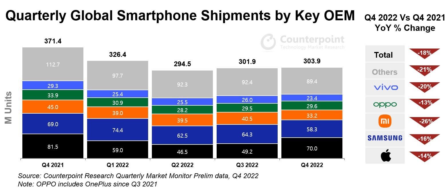 这一趋势持续到了去年四季度,生活成本危机、劳动力市场短缺以及消费者购买力的下降,导致全球前五大手机制造商的出货量均出现两位数的下滑。