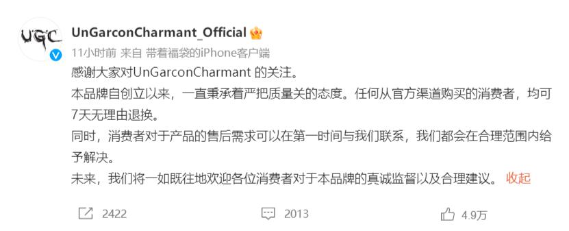 与此同时,UnGarconCharmant官方微博也发布声明,表示品牌对质量严格把关,官方渠道购买7天无理由退换,消费者对售后的需求也会予以解决。