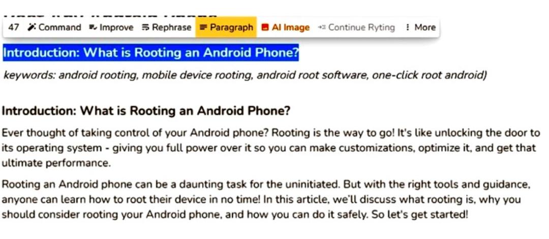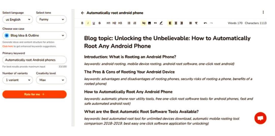 在我的示例中,我要求它为一篇关于“Rooting Android 手机”的博客文章生成大纲。在下面的屏幕截图中,您可以看到它创建了一个完美的标题、介绍、主体和结论以及关键字建议。