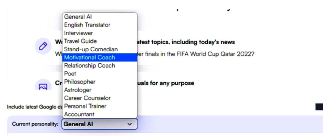 还有一个很好的个性转换,可以改变 AI 的回复方式。例如,可以让它表现得像诗人、会计师、哲学家、采访者、脱口秀喜剧演员或私人教练。但是,如果您使用不同的个性,Google 搜索集成将被删除。