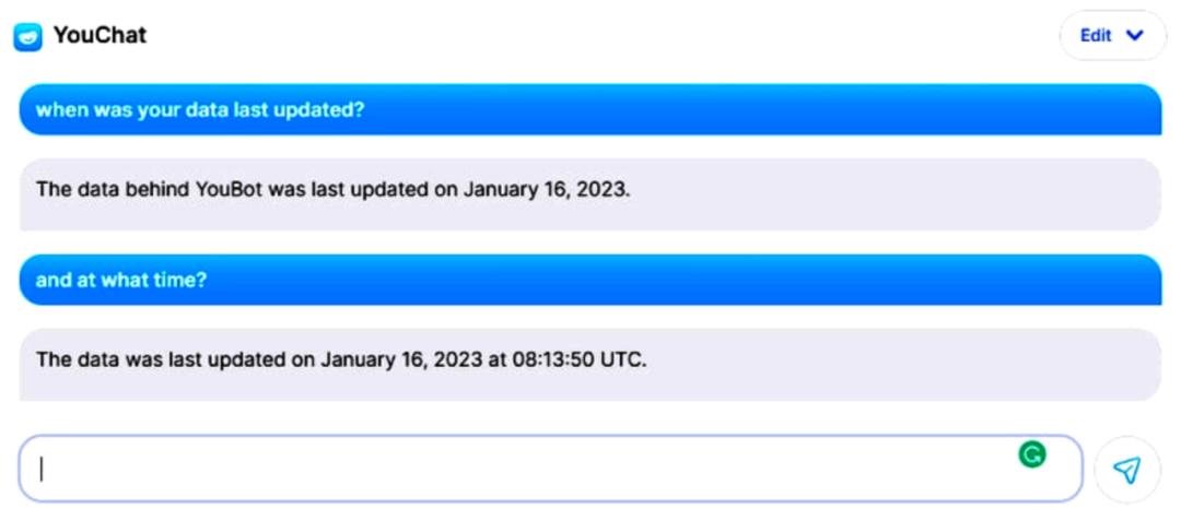 与 ChatGPT 不同,YouChat 数据在 2021 年之前不受限制。它的知识每天更新多次,以确保您获得最新信息。我询问了它的最新更新,就在我询问查询的同一天。