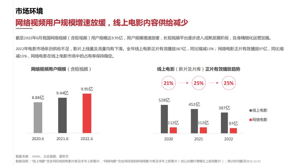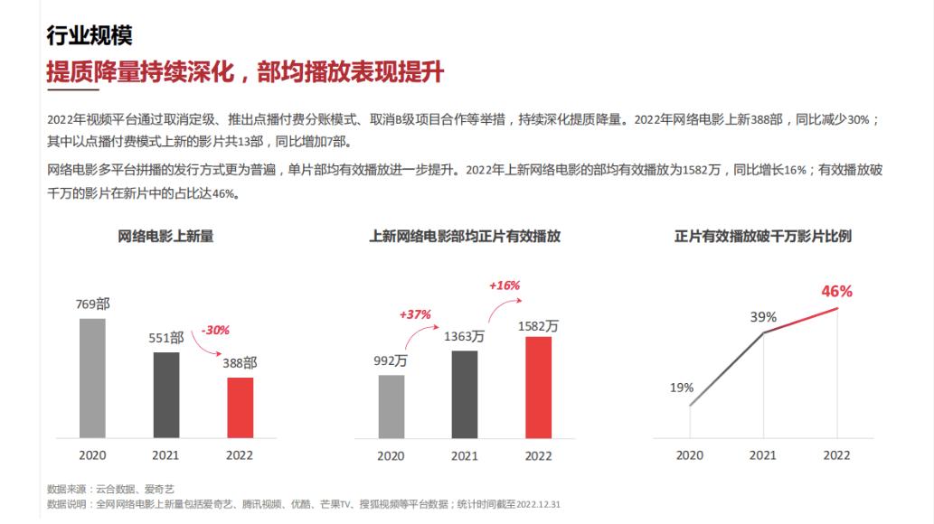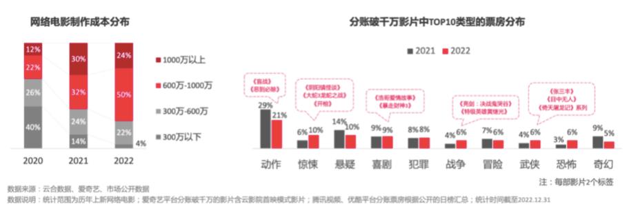 质量提升的数据支撑是制作成本:2020年成本在600万以上的网络电影只占34%,2022年这一数字则来到了74%。