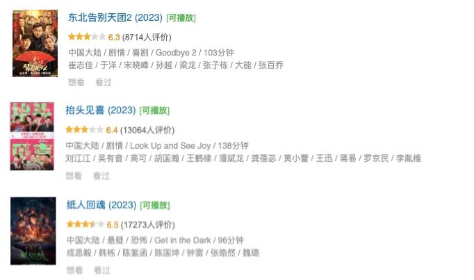 2023年以来头部分账片的题材类型以民俗恐怖片、喜剧片、动作枪战片为主流类型,并且平均口碑、影迷群体热度表现可圈可点。与过去网络电影常见的3、4分甚至不开分现象不同,《东北告别天团2》《抬头见喜》《纸人回魂》豆瓣评分均在6分以上,其中《纸人回魂》有17000人参与打分,《抬头见喜》有13000人参与打分,这已基本与一些腰部院线电影的打分人数接近。
