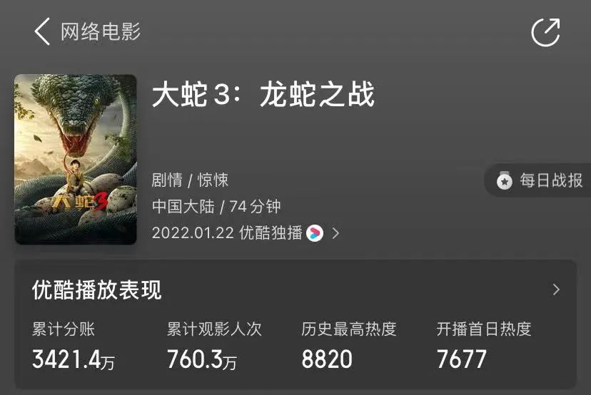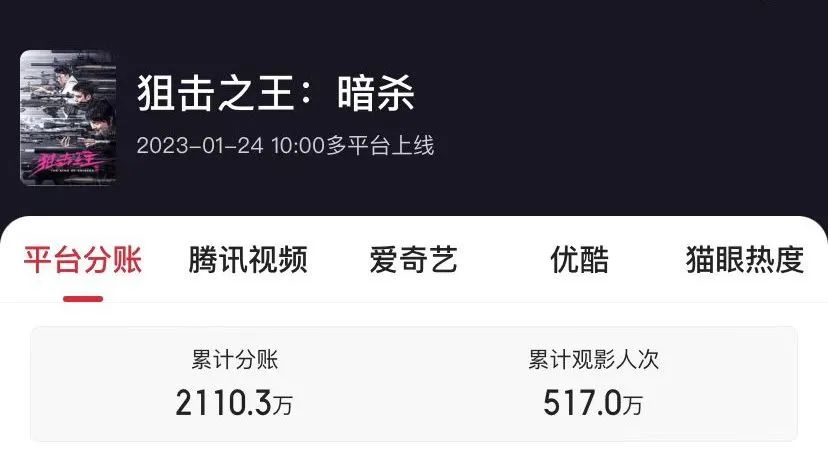 比如《盲战》收获了点播期1714万、会员期2222万,总票房3900万,片方分账达到3302万;《目中无人》总票房2976.4万,片方分账达到2619.9万;今年的《天龙八部之乔峰传》还在点播期中,总票房已经达到1450万。像《盲战》这样收获3000万+分账票房的,以院线市场中制片方+发行方共43%的比例来看,《盲战》的制片方收入基本相当于在院线市场收获了约一亿元票房级别。